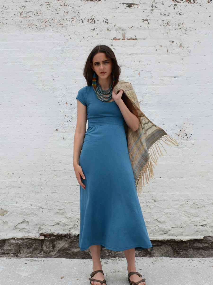 The bodice is double-layered for gentle support and subtle structure, gathered into a wide waistband that honors the waist without constriction. Flowing from there, the full-length skirt drapes in soft, effortless motion—crafted in our signature lightweight hemp stretch fabric that breathes, moves, and endures.